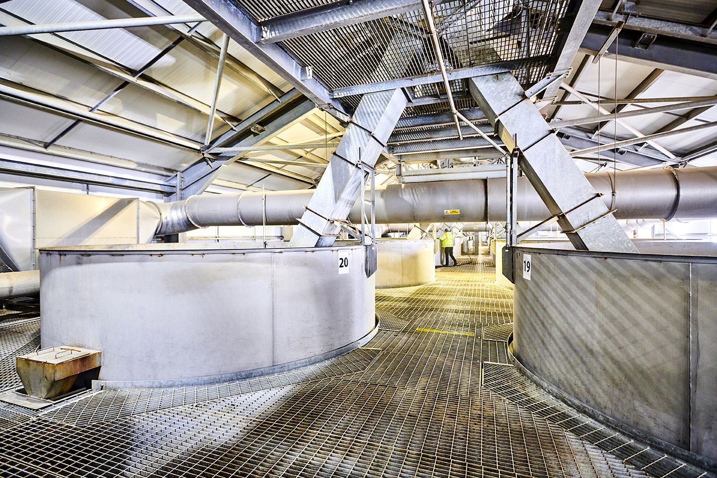 For the first stage of the active malting process, which is steeping, our Tweed Valley Maltings is home to our Jubilee Steephouse. In here, there are 24 large cylindroconical steeping vessels. They are 11 metres tall and five metres wide, each with the capacity to hold between 65 and 75 tonnes of barley.