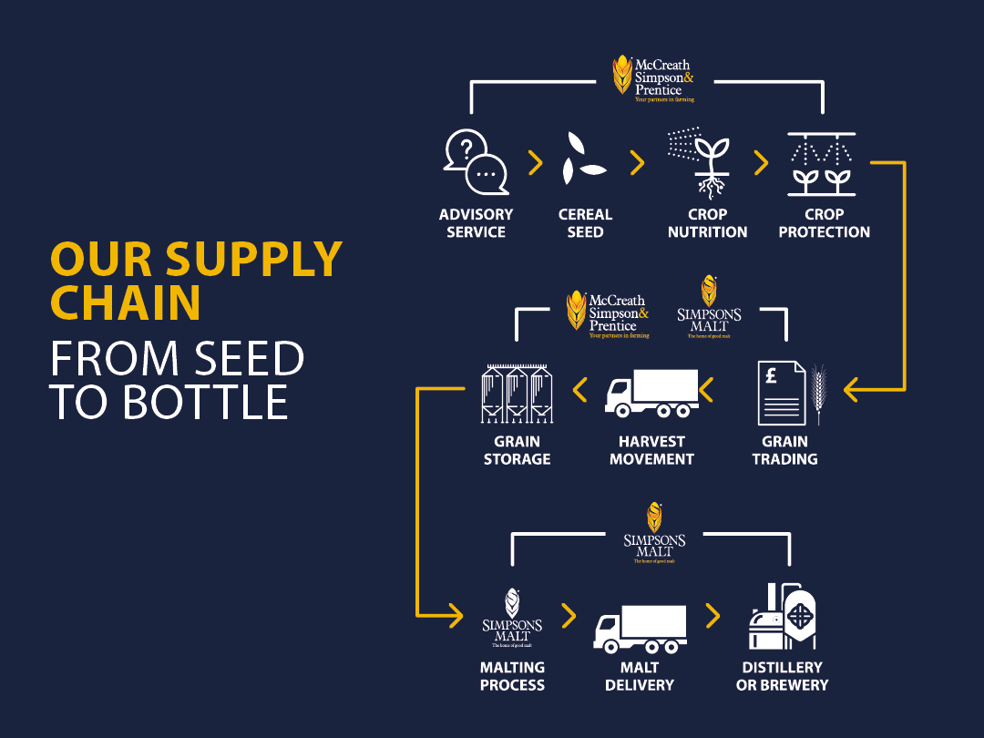 Founded by David McCreath OBE in 1980, McCreath Simpson & Prentice is one of the UK’s leading agricultural merchants supplying farmers from the Highlands of Scotland to North Yorkshire with a range of farm inputs, including cereal seed, livestock feed, grass and small seeds, agrochemicals and fertiliser.